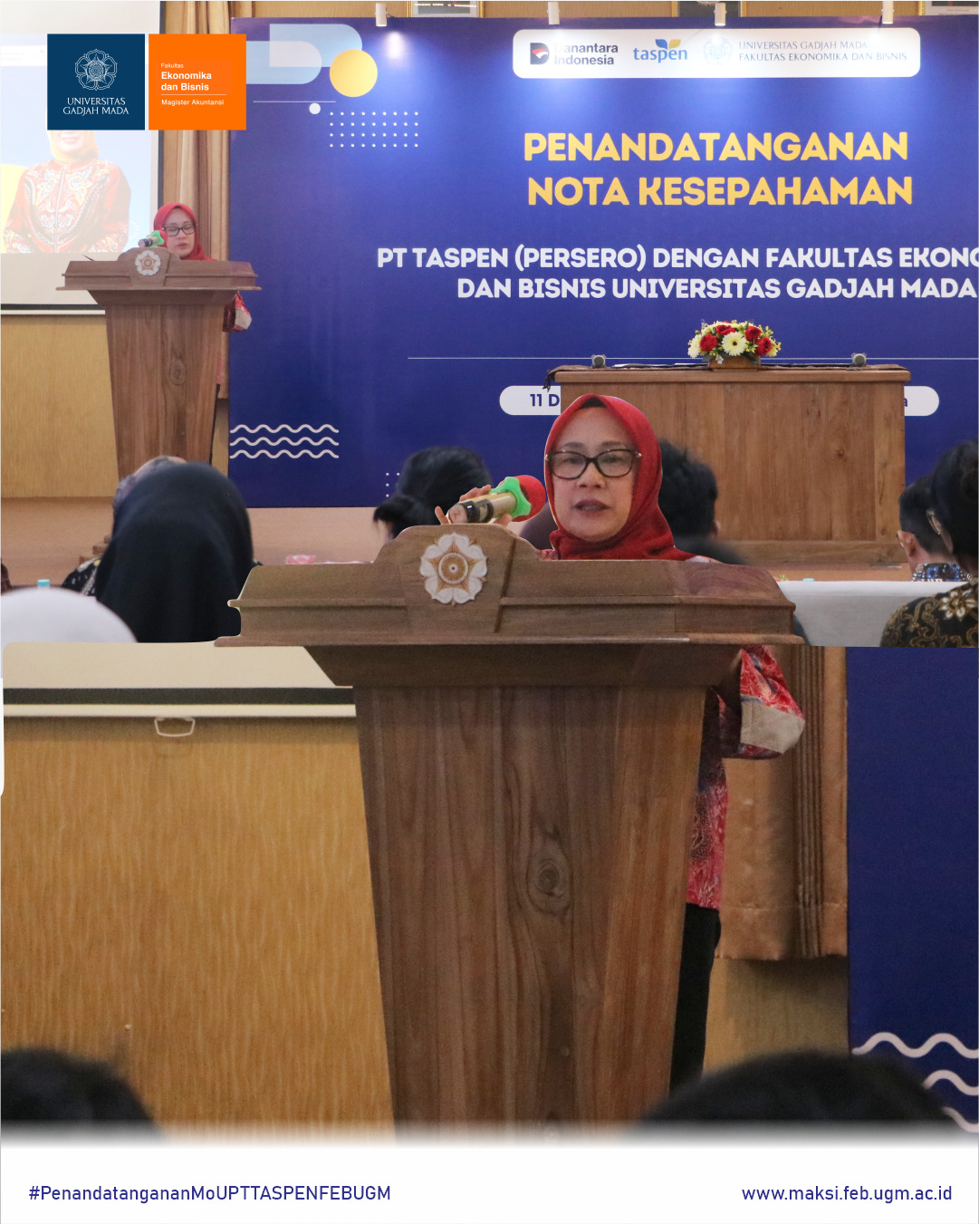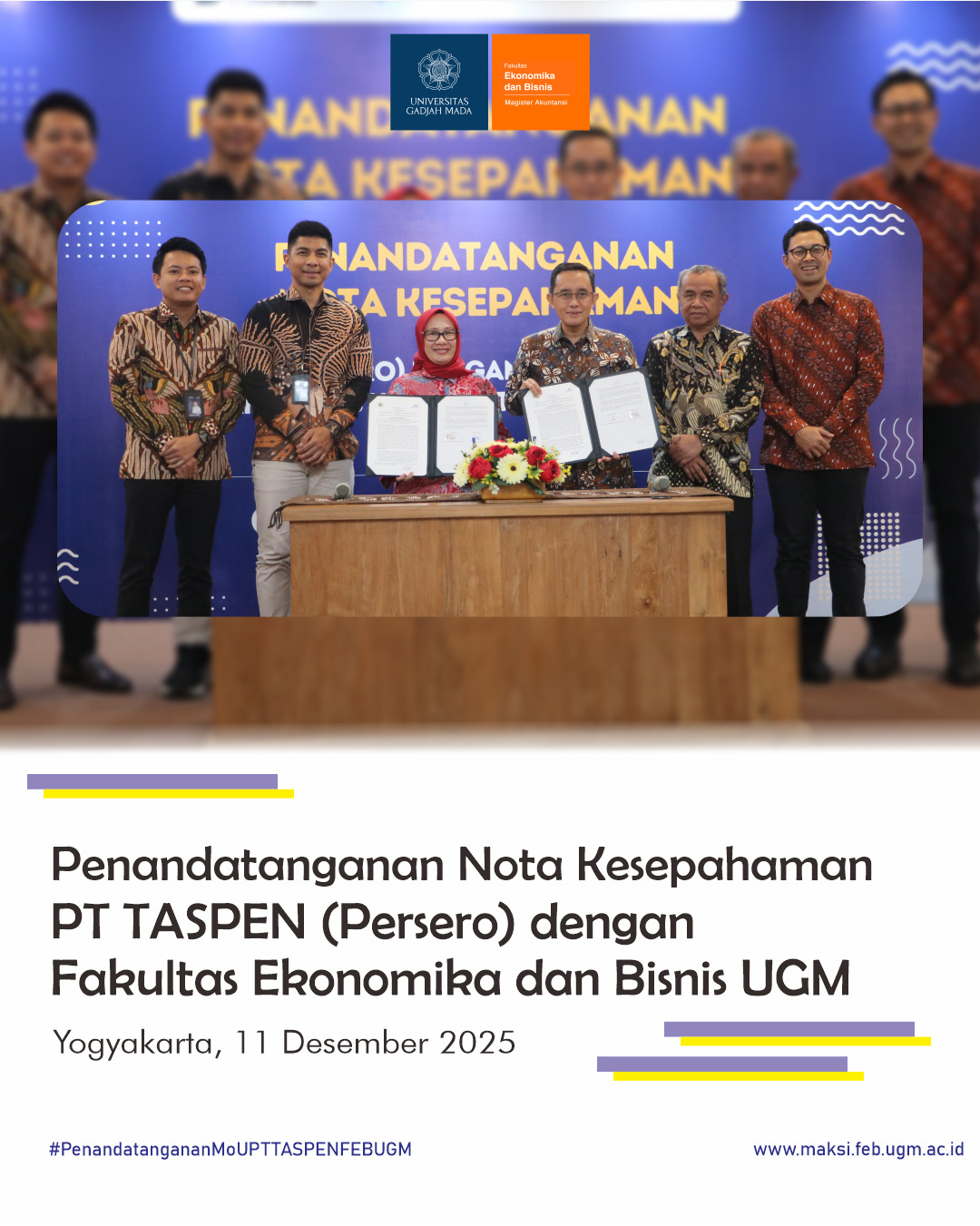 Kamis, 11 Desember 2025 Fakultas Ekonomika dan Bisnis Universitas Gadjah Mada (FEB UGM) menyelenggarakan kegiatan Penandatanganan Nota Kesepahaman (MoU) dengan PT Taspen (Persero) bertempat di Ruang Auditorium Drs. Soekamto, M.Sc., Lantai 3 Gedung Magister Akuntansi FEB UGM. ...