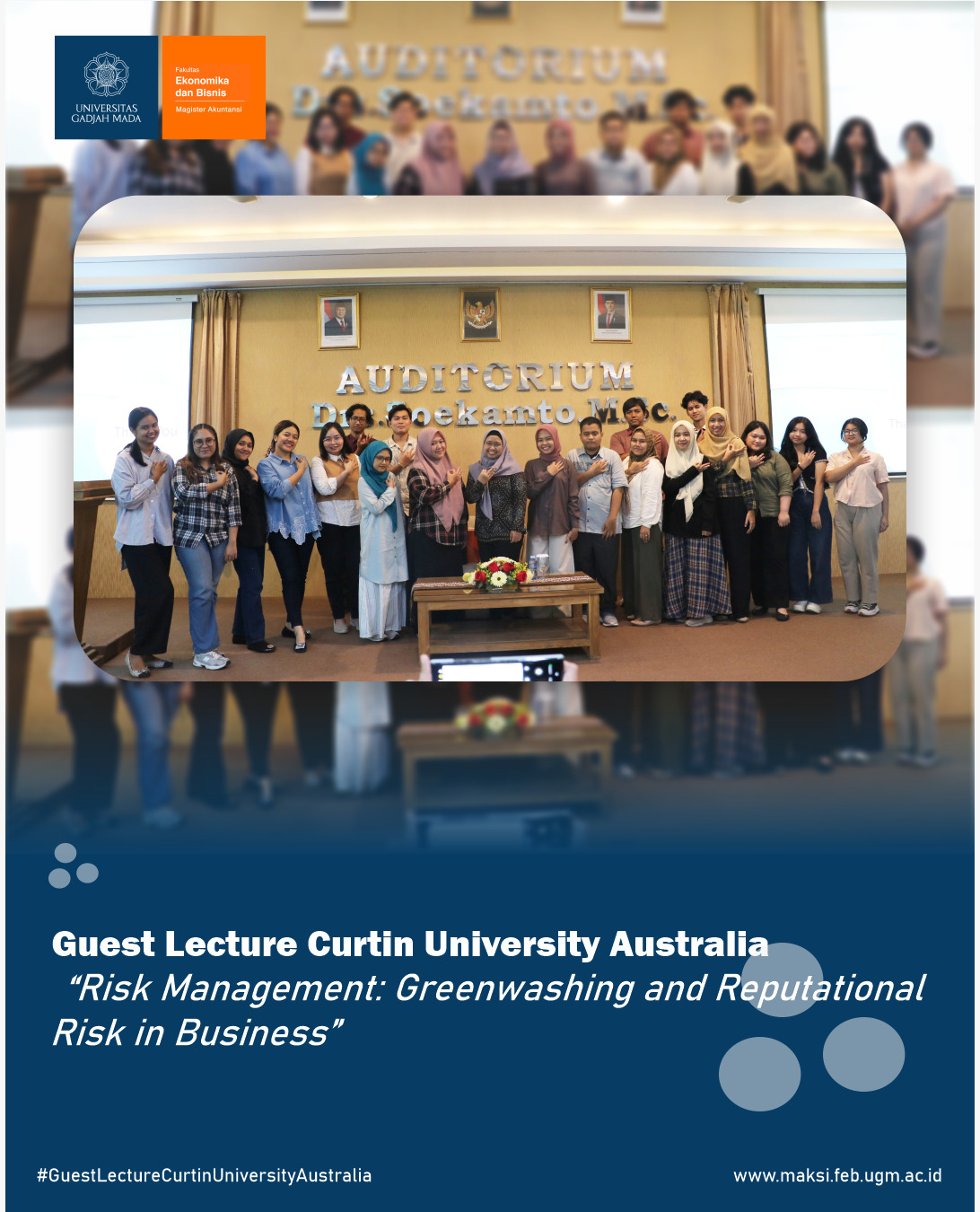 Program Studi Magister Akuntansi (Prodi MAKSI) Fakultas Ekonomika dan Bisnis UGM (FEB UGM) kembali menyelenggarakan kegiatan akademik internasional melalui Guest Lecture dengan tema “Risk Management: Greenwashing and Reputational Risk in Business”. Kegiatan ini berlangsung pada Kamis, 20 November 2025, pukul 13.00–15.00 WIB, bertempat di Ruang Auditorium Drs. Soekamto, M.Sc., MAKSI FEB UGM
